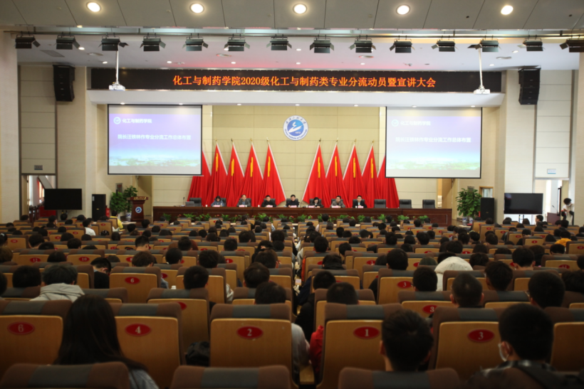 在四教多功能报告厅召开了2020级化工与制药类专业分流动员暨宣讲大会。院长汪铁林,院党委副书记周丹,副院长金放,院长助理闫志国,各系(中心)主任、副主任及专业教师,2020级辅导员、班主任,2020级化工与制药大类全体同学参加会议,会议由周丹主持。