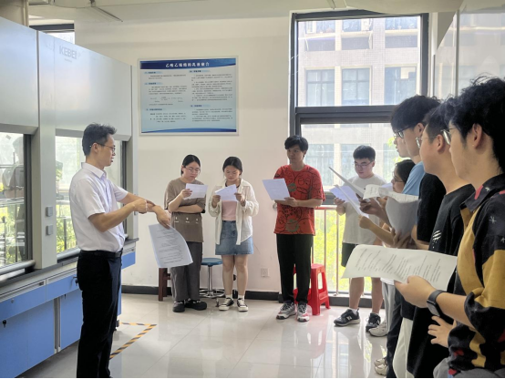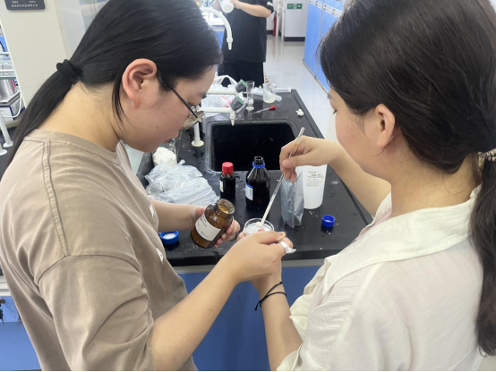 组织学生在精细化工实验室开展“玩转科学实验,自制无添加防晒霜”劳动教育实践活动,化学工程教研室主任张林锋教授为参加活动的学生讲解防晒霜制备原料及作用原理,同学们分组设计实验配方并自制了“专属”防晒霜。