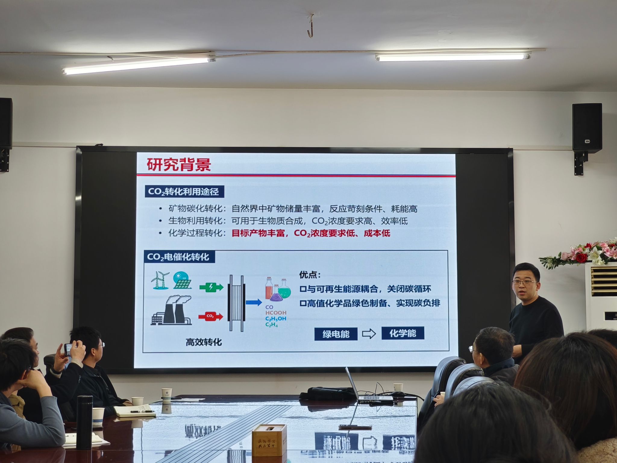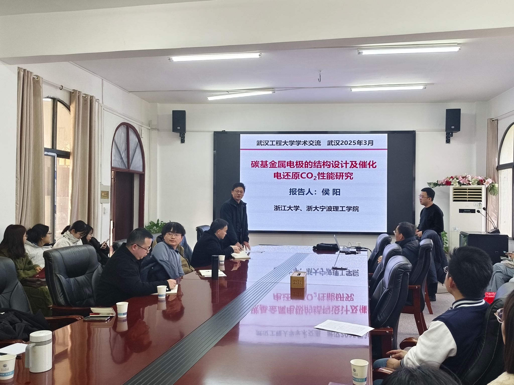 报告结束后,侯阳教授与师生进行了互动交流,分享了团队的研究成果和研究经验,耐心回答了大家提出的问题。此次报告对师生深入了解和研究碳基金属电极材料的创制及其在CO2电催化方面的应用提供了有益指导。