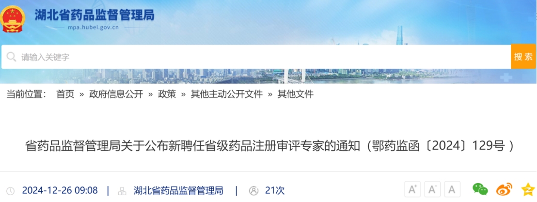 本网讯(通讯员 张双双)12月26日,湖北省药品监督管理局发布了“省药品监督管理局关于公布新聘任省级药品注册审评专家的通知(鄂药监函〔2024〕129号 )”,我校电影天堂