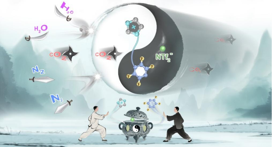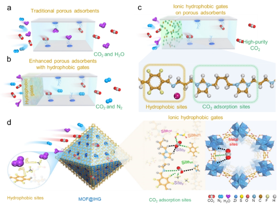 通过吸附分离从潮湿烟气中高效提取高纯度CO2,为碳减排提供了一种低能耗、可持续的路径。然而,H2O蒸汽和N2的共吸附问题严重制约了分离效率,成为工业应用中的关键难题。为此,该研究提出了一种创新的离子疏水门控策略,通过在金属有机框架材料表面组装疏水性离子液体和富氟对苯二甲醛,构建了兼具H2O渗透屏障和CO2选择性传输通道的双功能壳层,同时保持多孔内核的结构和孔道完整性,实现从潮湿烟气中一步捕集高纯度CO2。该材料CO2/N2选择性高达1780(15/85,v/v),可从高湿烟气(RH=80%)中直接获取纯度99.999%的CO2。相比传统吸附剂只能阻隔N2或H2O的局限,该策略实现对两者的协同抑制,并突破了材料中“疏水性”与“CO2选择性”难以兼得的固有矛盾。此外,该策略展现出良好的通用性与循环稳定性,为潮湿工况下的低能耗、高效率碳捕集提供了新思路。
