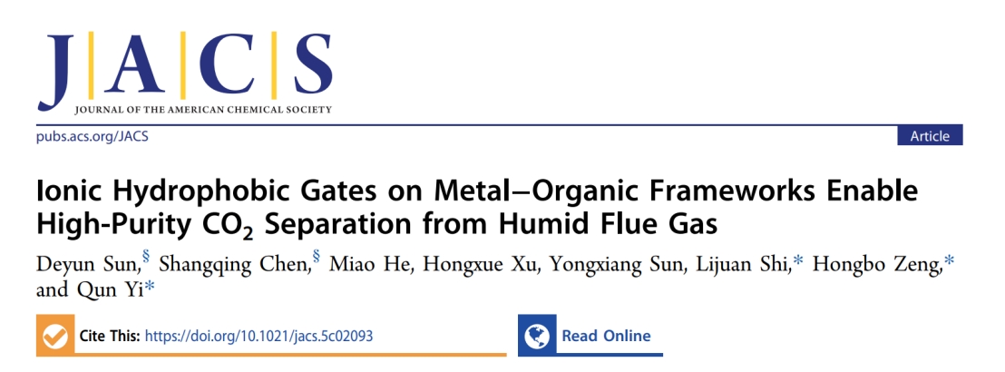 绿碳技术与智能材料团队在化学领域国际顶级期刊Journal of the American Chemical Society上发表了题为“Ionic Hydrophobic Gates on Metal-Organic Frameworks Enable High-Purity CO2 Separation from Humid Flue Gas”的研究论文。Journal of the American Chemical Society(影响因子15.6)是全球化学领域最具影响力的学术期刊之一,长期位列中科院化学大类1区,具有极高的学术声誉和影响力。电影天堂