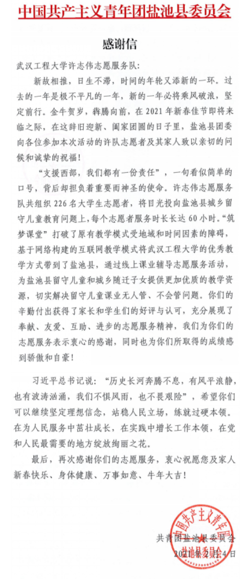 本网讯(通讯员 沈霁月)“一句看似简单的口号,背后却担负着重要而神圣的使命。正因有了226名志愿者的付出,才切实解决了盐池留守儿童和城乡随迁子女课业无人管、不会管的问题……”,2月6日,电影天堂 收到了一封来自宁夏盐池县团委的感谢信,信中感谢的是学院许志伟志愿服务队。