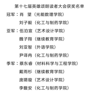 经过两轮的激烈角逐,共有10名同学脱颖而出,分别荣获一等奖、二等奖、三等奖。15名参赛选手获得优秀奖。他们或以真挚的赞美之情令人动容,或以纯熟的朗诵技巧让人折服,或以激昂的表演风格使人振奋。一位位英雄的形象通过他们的朗读变得更为立体、更加伟岸。此间山河,百代过客。月落参横,万古长青。12月12日,电影天堂