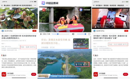 图12 实践团成员宋子兴所摄视频在浙江台、淳安台以及学习强国平台新闻报道的部分画面