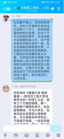 全体学生的一封信》。本科一支部、二支部在QQ群课堂集中观看了《我们始终在一起》《那些疫情中的勇敢与爱》等短片,通过学习,党员们充分认识到学校关于疫情防控、线上学习的最新要求,深入了解了疫情期间的感人故事,在积极关注疫情动态的同时也掌握了科学的疫情防控知识,坚定了战疫必胜的信心。