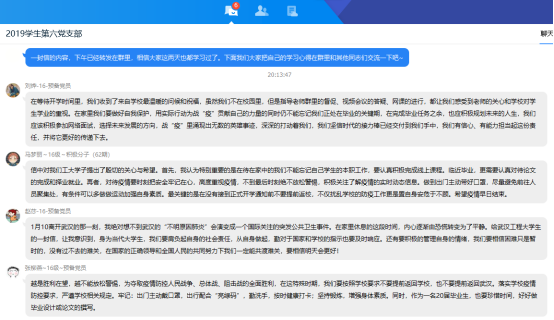 线上会议期间,各支部党员积极开展讨论,凝聚了正能量。学生党员们围绕最美逆行者的先进事例和身边亲友的抗疫事迹,结合化工、制药专业特色以及学生党员身份,谈认识、讲体会、话担当,进一步增强了责任感和使命感。本科五支部的叶令飞同学表示,将充分发挥党员先锋模范作用,自觉遵守相关防控要求,尽己所能为家乡贡献力量;本科六支部的毕业生党员赵莎同学表达了自己的抗疫决心,表示将积极响应学校号召、认真备战考研,自觉恪守学生党员本分,不负青春韶华;本科七支部的张慧双同学表示,疫情期间将尽可能做力所能及的事情,在学好专业知识的同时,不断树立正确的人生观、价值观。