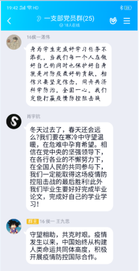 在学校推出一封信后,学生三支部立即组织支部党员通过网络,深入学习相关内容,领会有关精神。支部党员读信后深受鼓舞,展开热烈讨论,并在云端发起给学校写一封回信的活动,党员们踊跃参与,在群里晒回信、晒感想,表达自己对于学校、学院、同学的想念之情,并表示将继续做好防疫工作,在未接到返校通知时,坚持居家隔离、健康打卡、线上学习,积极配合学校的防控决策部署,争做防疫先锋,树好党员这面伟大旗帜。