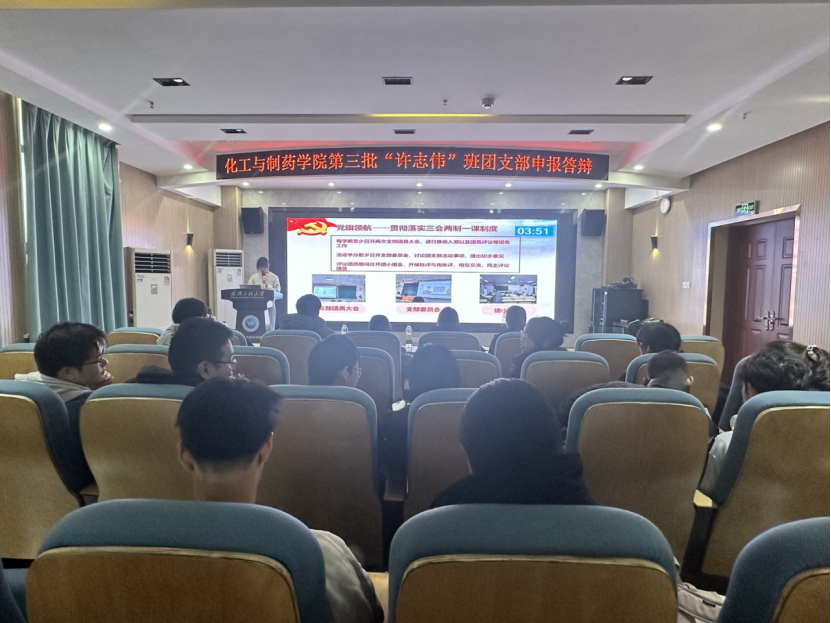在化工大楼610举行第三期许志伟班团支部争创活动,学院党委副书记周丹、化工系主任熊芸、药物制剂系主任冯菊红及各年级辅导员出席活动,活动由学工办主任张小琪主持。