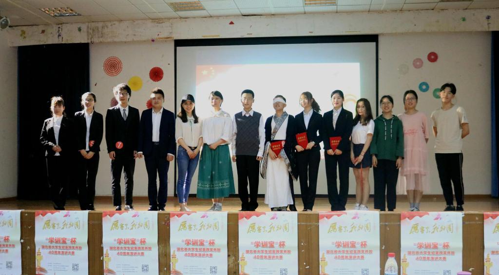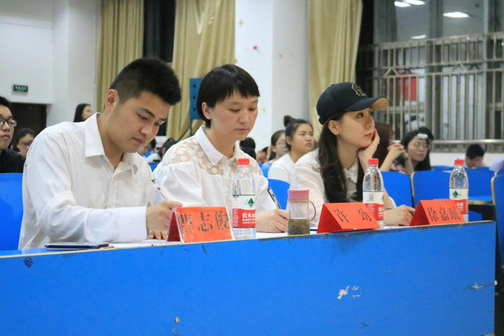 承办的"学训宝"杯“厉害了,我的国”主题湖北省大学生纪念改革开放四十周年演讲大赛决赛于5月14晚,在模拟法庭成功举行。“学训宝”集团商务总监曹志俊,湖北之声(fm104.6)主持人、湖北省演讲协会会员徐嘉珉老师,国家级普通话测试员、校团委艺术教研室指导老师许劲老师,电影天堂