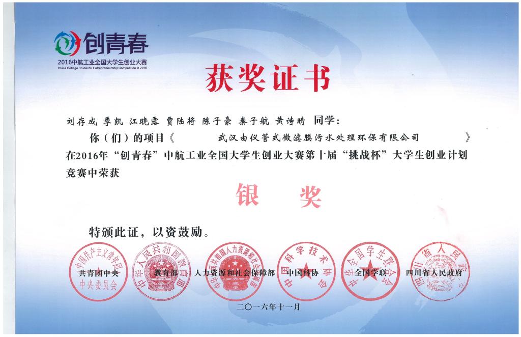 11月15日-20日,由共青团中央、教育部、人力资源和社会保障部、中国科协、全国学联、四川省人民政府联合主办的2016年“创青春”全国大学生创业大赛终审决赛在电子科技大学清水河校区落下帷幕我校电影天堂 研究生刘存成负责的计划创业项目《武汉由仪管式微滤膜污水处理环保有限公司》经过激烈的角逐,成功获全国银奖