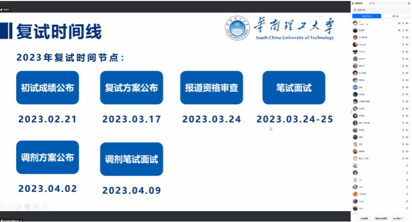 复试、调剂经验分享会邀请了2019级林元典、曾礼欢、郜浩森、程文丽四位成功考研上岸的学长学姐作为分享嘉宾,他们针对不同时间段需要准备的工作进行了分享,提醒同学们把握好复试准备的黄金时间,做好复试规划,从专业知识、英语听说能力和综合素质三个方面提高自身竞争力,并通过真实案例,让同学们深刻认识到考研就是一场“信息战”,希望考研学生主动出击、顺利上岸。