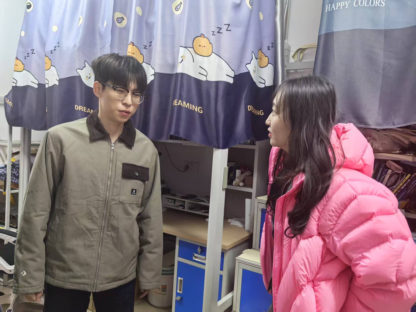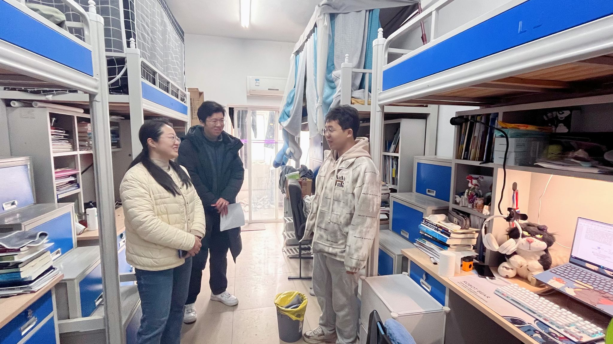 周丹一行进入宿舍,详细询问同学们返校后的生活及学习、科研情况。周丹与同学们亲切交谈:“回校后是否适应?食堂的饭菜是否可口?有没有困难?要注意保暖呀!”她叮嘱同学们要守好安全底线,注意消防、财产、交通等方面的安全。对即将实习的同学,叮嘱大家要遵守纪律,一切行动听老师指挥,要注意实习期间的安全。老师们认真查看每一间宿舍,对环境整洁、布置温馨的宿舍给予肯定与表扬,面对存在不足的宿舍,给出切实可行的整改方向,鼓励同学们共同营造舒适的居住空间。