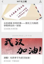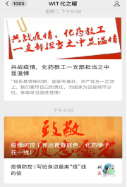 全体师生党员的倡议书》《新型冠状病毒防控指南》《化药学子为武汉加油微视频》等,及时有效地向师生宣传防治信息,引导广大师生正确认识、科学预防、正视疫情,增强自我保护意识,提升自我保护能力。发表《共战疫情——化药教工一支部担当之中显温情》《疫情防控——亮出青春底色,化药学子在一线》等文章,宣传学院师生在抗击疫情期间,用爱铸牢抗“疫”防线的先进典型事迹,弘扬正能量,为打赢疫情防控阻击战凝聚人心、鼓舞士气。