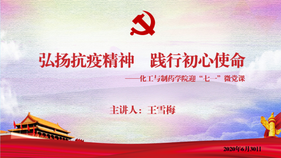 6月30日,学院党委书记王雪梅以网络报告形式为全院支部书记和党员代表上了一堂题为《弘扬抗疫精神 践行初心使命》的微党课,通过解读伟大的抗疫精神、党员志愿者和师生鲜活生动的抗疫事迹、谈如何践行高校教师的初心使命三个角度进行阐述。