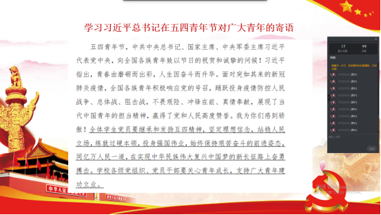 各本科生党支部坚持疫情防控不放松、理论学习不间断,通过网络学习平台,开展“传承五四精神 勇担青年使命”五月支部主题党日活动,确保学生党员学习教育活动常态化。