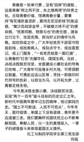活动过程中,支部党员们围绕学习习近平总书记五四寄语精神,深入理解习近平总书记五四寄语的准确内涵,学生党员们围绕青年学子使命与担当、疫情防控期间的学习与成长等话题展开热烈讨论,交流学习心得。本科第二支部党员鲁思汝表示,作为新时代青年,就要甘于奉献,到祖国最需要的地方,到人民最需要的地方,奉献青春,挥洒汗水,在祖国的广阔腹地和人民的坚实土壤中茁壮成长。