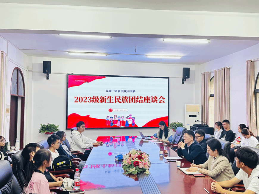 在西北区一号办公楼202会议室举办2023级新生民族团结座谈会,学院党委书记汪铁林、党委副书记周丹、2023级新生辅导员蓝传祺出席本次座谈会,学院40余名各民族新生参加,座谈由学院党务干事常琬笛主持。