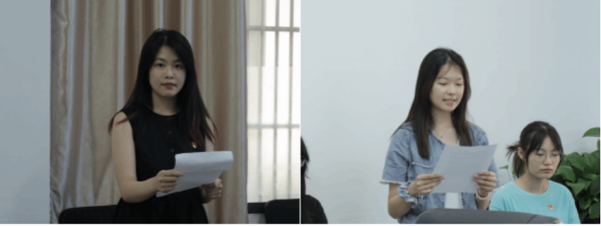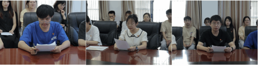 本科药卓党支部支委表态发言。张心怡总结了自己近一年来支部工作表现,她指出日常工作的圆满完成离不开老师们的关心指导与同学们的支持配合,今后将进一步学习身边优秀党员的工作方法,结合工作实际提出自己的创新思路,勤勉工作,不辜负同志们的信任。吴昕熹同学表示要从坚定理想信念,厚植家国情怀,勤学善思笃行,涵养高尚品德四个方面不断努力,成为一名有理想、敢担当、能吃苦、肯奋斗的新时代好青年,积极发挥模范先锋作用,带领身边的同学追逐光,靠近光,成为光,发散光。