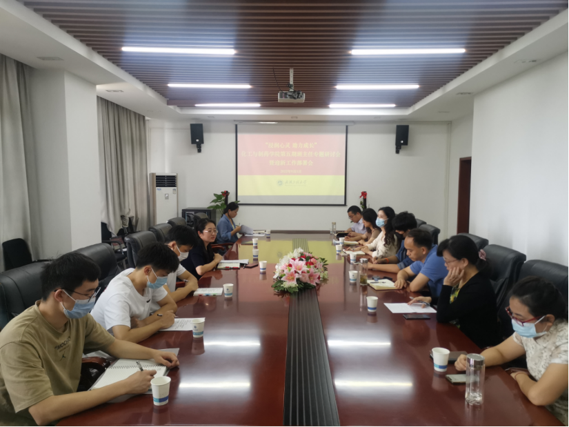 在化工大楼605会议室召开了“浸润心灵 助力成长”第五期班主任研讨会暨2022年迎新工作部署会,学院副书记周丹,中心主任及2022级全体班主任、学生党员副班主任参加会议,本科2022级新生辅导员沈霁月主持会议。