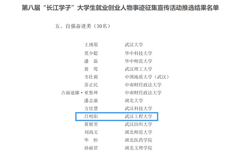 本网讯(通讯员 沈霁月)近日,湖北省教育厅第八届“长江学子”大学生就业创业人物事迹征集活动结果公布,全省共有150名大学生入选,电影天堂