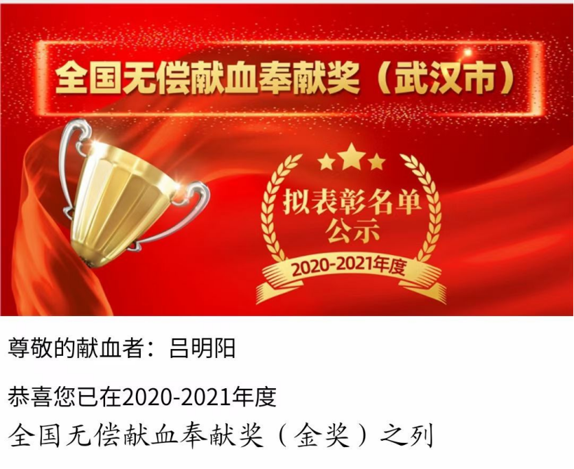 体测中心主管、校第七届“青马工程”青马班学员。连续四年坚持无偿献血,累计献血51次,献血量达1500ml全血和92. 5治疗量成分血。组建wit快乐献血小队,带动百余位同学参加献血,事迹先后被学习强国、楚天都市报、极目新闻、武汉电视台、河南电视台等多家媒体报道,并在微博热搜和同城热搜中位居前列。