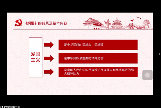 爱国主义是中华民族的民族心、民族魂,是中华民族最重要的精神财富,每一位青年学子都应当牢固树立爱党、爱国、爱人民的思想,涵养家国情怀。与会的师生党员在石大化工学院赵旭同学的带领下,共同学习了《新时代爱国主义教育实施纲要》的主要内容。