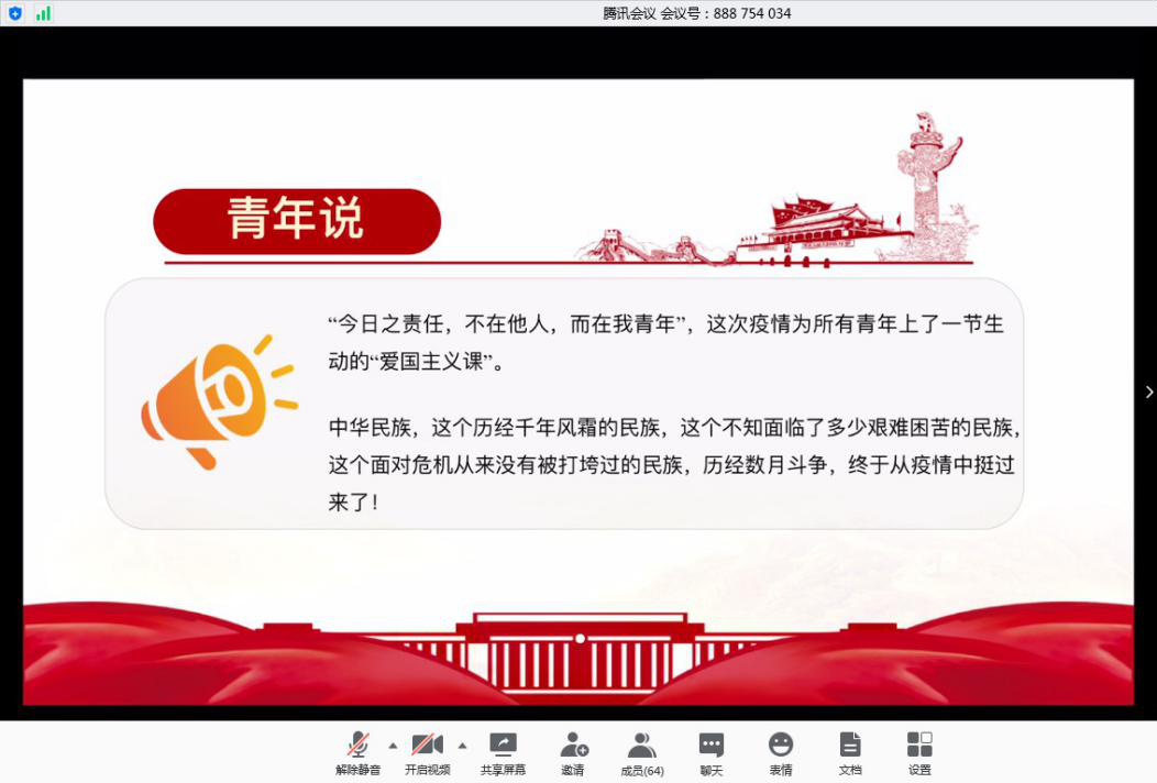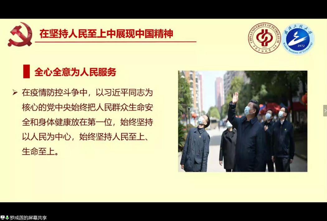的刘宇、刘正、李赛宽三名学生党员代表从自身出发,结合入党初心、疫情中的学习、毕业生就业考研等方面展开讨论,分享了自己的感受。来自石大的学生代表宋世龙讲述了自己作为青年学生党员,对于战“疫”与爱国的理解,诠释了新时代大学生的担当与责任。