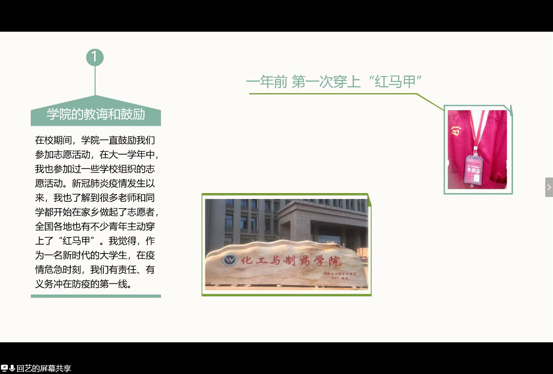 的回艺也毫不犹豫地加入到了小区的疫情防控执勤员队伍,为抗击疫情贡献出自己的微薄之力。活动过程中,她分享了自己在抗疫一线担任志愿者的小故事。