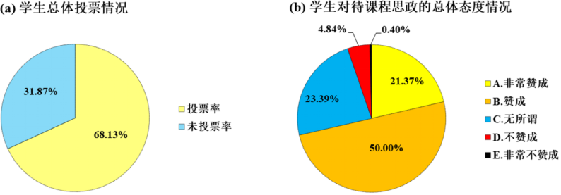 受疫情影响,本次“课程思政”专题教学采用线上教学的形式。教师课前准备与专业知识相关的思政类素材,并录制相关视频。学生端则在上课指定时段观看视频,并参与话题讨论。开课前,教师面向2017级化工类专业的364名本科生,发起了投票问卷调查,以收集学生们对“思政元素进课堂”的意见。本次调查共248名学生参与,投票率达68.13%。进一步地,调查结果显示,参与投票的学生中,有超过七成的人赞成在本课程教学过程中,融入思政类元素。这说明,大多数学生对“课程思政”教学抱有一定程度的期待。