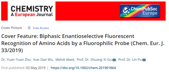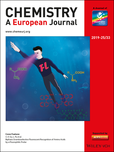 此研究成果前期以“Biphasic Enantioselective Fluorescent Recognition of Amino Acids by a Fluorophilic Probe”为标题、以full paper的形式发表在化学领域权威期刊《欧洲化学》(Chemistry-A European Journal)上()。该论文入选《欧洲化学》热点论文(hot paper),并被《欧洲化学》作为封面特色文章(cover feature)进行了介绍()。论文的共同通讯作者为电影天堂