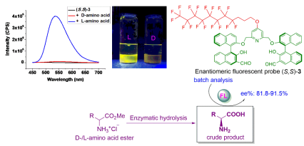 古双喜团队与美国弗吉尼亚大学化学系Lin Pu教授再次合作,在前期研究成果(J. Am. Chem. Soc.2019,141, 175-181;X-MOL学术资讯亮点介绍)的基础上设计了一类新型的亲氟荧光探针分子,利用该探针分子首次实现了在氟相体系中的氨基酸手性荧光识别。由于氟溶剂的疏水疏酯性,在氟相中的荧光识别可以有效排除氨基酸不对称合成体系中其他物质对荧光测试的干扰,从而实现对反应粗品的直接测试,打破制约其在不对称合成高通量筛选中的瓶颈。研究团队应用该荧光探针体系成功实现了对酶水解法制备氨基酸的快速手性分析和ee值测试。