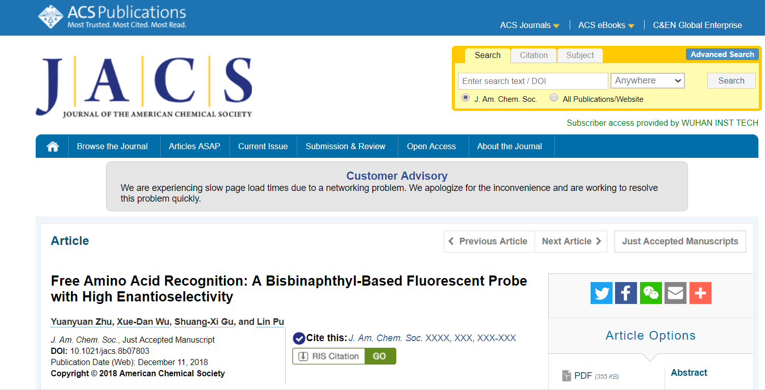 古双喜博士、化学与环境工程学院朱园园博士分别以通讯作者和第一作者身份与美国弗吉尼亚大学Lin Pu教授(通讯作者)合作在化学领域顶尖期刊Journal of the American Chemical Society(简称JACS)上发表标题为“Free Amino Acid Recognition:A Bisbinaphthyl-Based Fluorescent Probe with High Enantioselectivity”的高水平研究论文。(论文链接:)