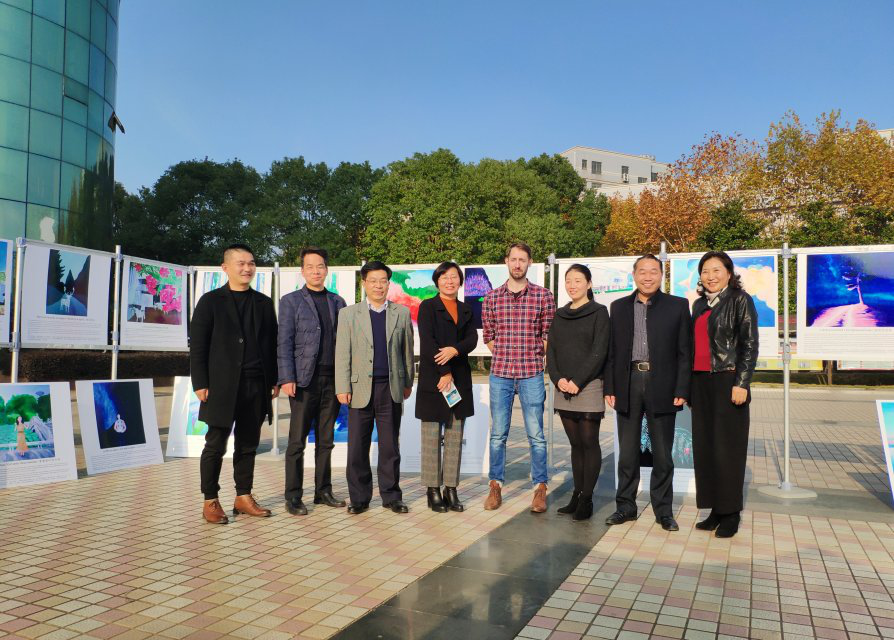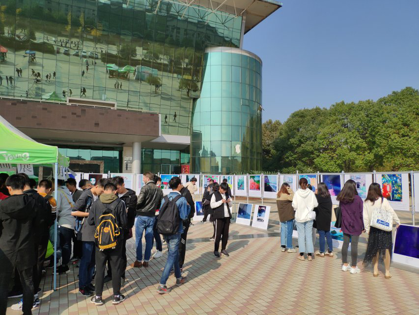 法籍教师Yoann个人画展在流芳校区大礼堂门口举行。校党委副书记郑丹凤,学校组织部、宣传部、人事处的负责人,以及电影天堂