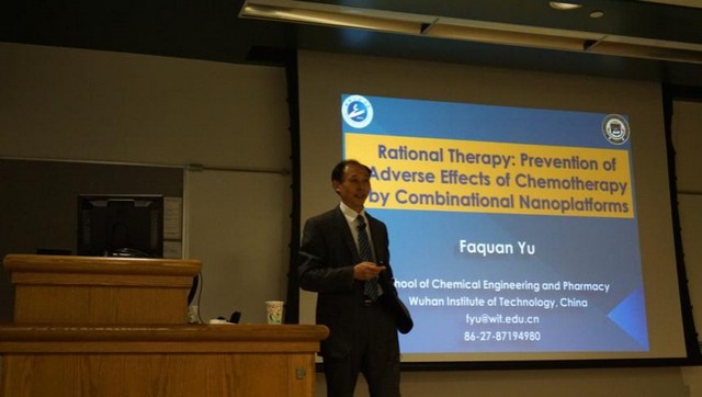 在美访问期间,喻教授首先与学院院长James Dalton教授就学院管理模式、学生培养模式、教授治学、教师分类管理、学生评教等问题进行了深入交流与讨论。随后,喻教授与Greg Amidon(美国药剂学会会士),Gordon L. Amidon (Molecular Pharmaceutics杂志主编,美国联邦药剂杰出科学奖获得者),Steven P. Schwendeman(药剂系主任),Duxin Sun,David Smith(Pharmaceutics Research杂志编辑),Anna Schwendeman,Rosania Gus(美国总统青年科学家奖获得者),Wei Cheng等教授进行了为期两天的一对一学术探讨。最后,喻教授给教授与博士研究生作了题为“Rational Therapy: Prevention of Adverse Effects of Chemotherapy by Combinational Nanoplatforms”的学术报告,并与他们进行了深入探讨。该报告针对癌症的化学治疗中“如何降低治疗的副作用”的难题,从材料的工程化设计角度提出了一系列新的思想。报告展示了喻教授课题组的最新研究成果,引起了在座者的浓厚学术兴趣。