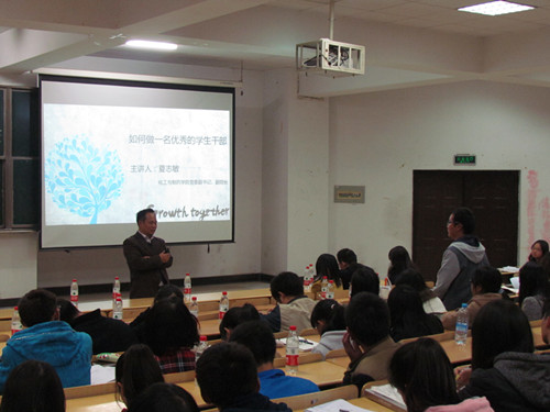 夏志敏老师指出学生干部是连接学院和学生之间的桥梁纽带,学生干部在建设优良学风、丰富学生第二课堂、繁荣校园文化等方面起到积极作用。他要求学生干部正确处理好学习和工作的关系,加强自我教育、自我管理和自我服务。他建议学生干部在学生工作中要不断提高自己的写作能力、表达能力、分析问题和解决问题的能力以及组织协调能力,培养具备良好的政治素质、业务素质和心理素质。夏老师又结合自己学生时代学生干部经验,鼓励大家勇于尝试,在学生工作岗位上不断锻炼和提高自己的综合素质和能力。最后,夏老师回答了部分同学的提问。