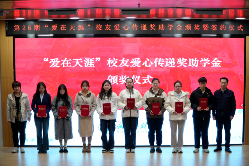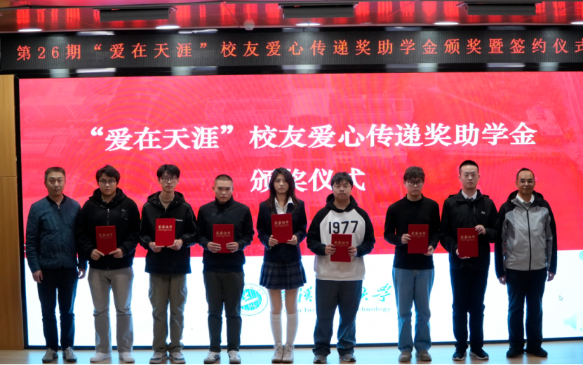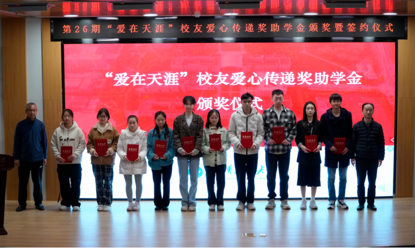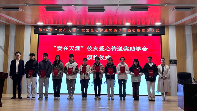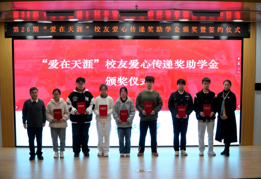 仪式上,李志旭代表校党委、校行政对“爱在天涯”奖助学金设奖校友的一直以来为学校建设与人才培养做出的贡献表示衷心感谢,向此次获得奖助学金的学生表示祝贺。他表示,学校各项事业的发展进步离不开广大校友的倾情相助和鼎力支持,希望各位校友能常回家看看,一如既往地支持和关心学校发展,用校友智慧和校友力量共助学校谱写事业高质量发展的新篇章。他向获奖学生提出殷切期望:一是要坚定理想信念,树立报国之志,以习近平新时代中国特色社会主义思想立根铸魂、强基固本,厚植家国情怀,汲取精神伟力,用实际行动践行“请党放心,强国有我”的青春誓言。二是要常怀感恩之心,常举谢恩之行,将感恩之情牢记于心,将大爱之心薪火相传,让青春在奋斗与奉献中绽放绚丽光彩,以更加优秀的表现回报社会、回馈母校,不负校友们的厚望。三是要坚持自强不息,锤炼过硬本领,在所学专业领域深入钻研,以“勤为径”向“上”攀登,以“心作谷”向“下”扎根,聚焦内涵式发展,在勤学中扎实学识,在实践中锤炼本领,奋力书写挺膺担当的青春篇章。