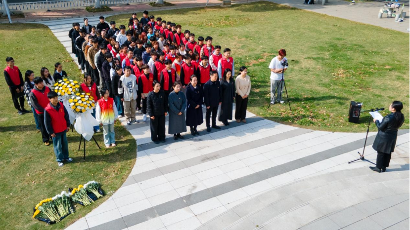 活动中,许志伟党员示范班、许志伟志愿服务队学生代表为许志伟雕像敬献花篮。全体师生代表面向许志伟雕像肃穆伫立行默哀礼。