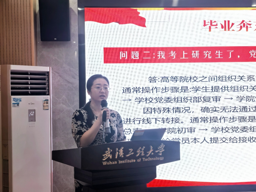 周丹详细讲解了毕业生党员党组织关系转接的相关政策和流程,强调组织关系转接是党组织的一项严肃工作,毕业生党员们要增强党员意识、责任意识、纪律意识和组织观念,充分认识这项工作的重要性,要及时、准确落实组织关系。