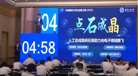 在中国国际大学生创新大赛(2025)湖北省赛中,由王翔、石长玮、姜兴茂老师指导,学生孙天齐、李玉洁、邱谦、黄筱妍、史瑨媛、姜语柔、辜越涛、陈紫芊、汪志成、雷雨田参与的“点石成晶——人工合成高纯石英助力光电子领域腾飞”项目荣获湖北省金奖。该项目自主研发出基于正硅酸四乙酯的中温中压水热合成技术,成功实现了从基础原料向超高纯石英砂的绿色高效转化。