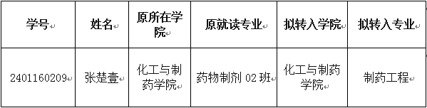 本科生专业调整暂行规定》文件有关规定和学校本科生院《关于做好2024-2025学年第二学期普通本科生转专业的通知》的有关要求,经学生个人申请、学院领导小组对申报材料的审查和面试考核,拟同意张楚壹1名学生的转专业申请。现将名单予以公示。