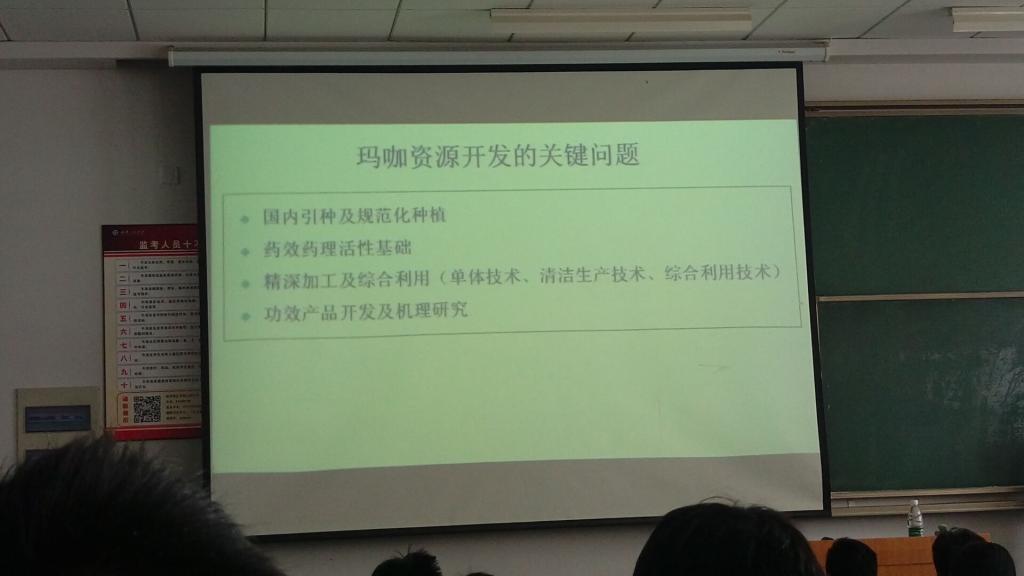 部分师生共计150余人聆听了报告。赵喜红教授对付春华教授进行了简要介绍,并对其到来表示热烈欢迎。付教授向在座的师生讲述了药食同源食品渊源及意义并分析了我国药食同源食品发展现状。接着,付春华教授向现场师生介绍了药食同源植物玛咖研究与开发问题。付教授主要从对玛咖的认识,目前国际上玛咖宣称的用途,以及玛咖资源开发的关键问题等三个方面对药食同源植物玛咖研究与开发问题做了详细介绍。