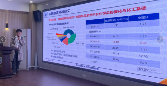 黄毅博士分别从:1.典型的中低变质程度煤热解工艺与产物分布特征;2.煤焦油中酚类化合物萃取精流分离;3.煤焦油制氢制环烷基油品工艺过程分析;4.煤焦油制高性能航天燃料全过程优化与系统评价等四个方面详细讲述了中低变质程度煤热解焦油精制环烷基油品基础研究,让同学们学到了更多关于石油能源的化学工艺。提问环节,两位博士分别对在场师生进行了细致解答。